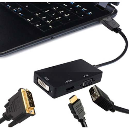 4XEM 3 In 1 DisplayPort to HDMI DVI VGA Adapter - DVI/DisplayPort/HDMI/VGA A/V Cable for Projector, Workstation, Audio/Video Device, HDTV, Computer, Monitor, Notebook, Blu-ray Player, DVD Player, MacBook Pro, MacBook Air - First End: 1 x DisplayPort Male Digital Audio/Video - Second End: 1 x HDMI Female Digital Audio/Video, Second End: 1 x 15-pin HD-15 Female VGA, Second End: 1 x DVI Female Video - 10.8 Gbit/s - Supports up to 3840 x 2160 - Black ADAPT 3-IN-1 DP CONVERTER