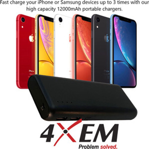 4XEM fast charging 12000mAh portable power bank for iPhone, Samsung Galaxy S9, LG, Motorola delivers a quick charge to keep you going. This compact 2.4A 12000mAh fast charging battery pack is easy to carry, very reliable and efficient. Charge any smart phone at least 2-3 times. Our 12000mAh battery charger is light and compact making it your ideal charger when you are on the move. Charge your Samsung Galaxy S10 at least twice and your iPhone 8 or iPhone 11 up to 4 times quickly without harming your device. All our portable chargers have 4 LED indicators representing 25% capacity to let you know when you need a re-charge. Compatible with smartphones, smart watches, fitness bands, headphones, Bluetooth speakers, cameras and other Bluetooth devices.4XEM wireless fast charging power banks are backed by our unmatched 1-year warranty!