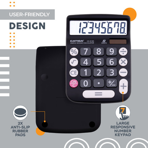 Large and Responsive Buttons: Effortless Input Enjoy a smooth and efficient typing experience with the CATIGA 8185 Calculator’s large and responsive buttons. The user-friendly design ensures that each press registers accurately, preventing input errors and enhancing your productivity. Spend less time double-checking and more time completing your tasks with confidence. Anti-Slip Rubber Pads: Stability at Your Fingertips Stability is key when using a calculator, and the CATIGA 8185 delivers just that.