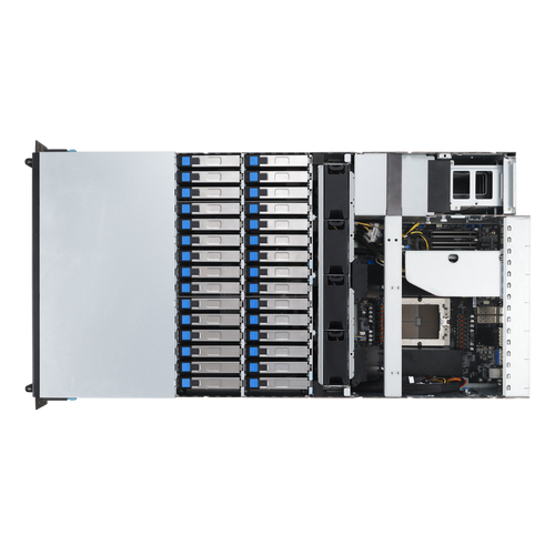4U single-socket high-density storage server powered by AMD EPYC™ 9004-series processor, supporting up to 12 × DDR5 DIMMs, 2 × SATA and 6 × NVMe SSD hot-swap bays, 60 tool-less 3.5-inch hot-swap bays, 2 × PCIe 5.0 x16 and 2 × PCIe 5.0 x8 slots, and onboard ASUS ASMB11-iKVM management for enterprise AI/HPC workloads.