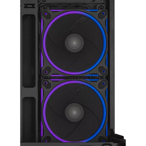 - Curved tempered glass panel extends seamlessly from the front to the side, offering a panoramic view of the components from almost any angle