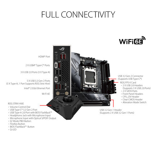 Introducing the ASUS Republic of Gamers STRIX X670E-I Gaming WIFI Mini-ITX Motherboard, a powerhouse of performance engineered for enthusiasts and gamers seeking uncompromising power in a compact form factor. This motherboard is built around the AMD X670 chipset, primed to unleash the full potential of the latest AMD Ryzen 7000 Series processors.