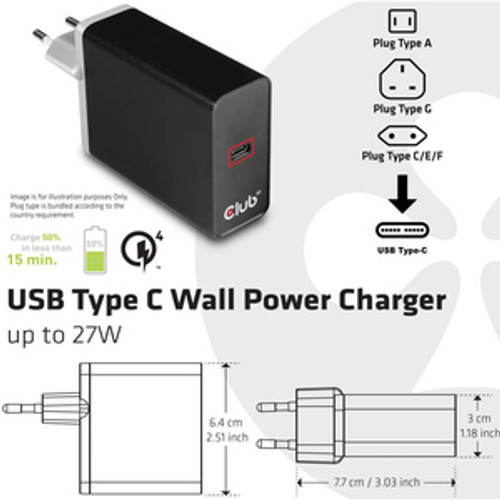By adopting PD Charging technology and charging function through USB Type C interface the Club3D USB Type C Power Charger offers unique functionality. It will charge your device up to 27Watts. By using Qualcomm 4+ charging function battery life is protected by avoiding overheating while charging - this function is available by selected devices. It can charge from 0 to 50% in 15 minutes.