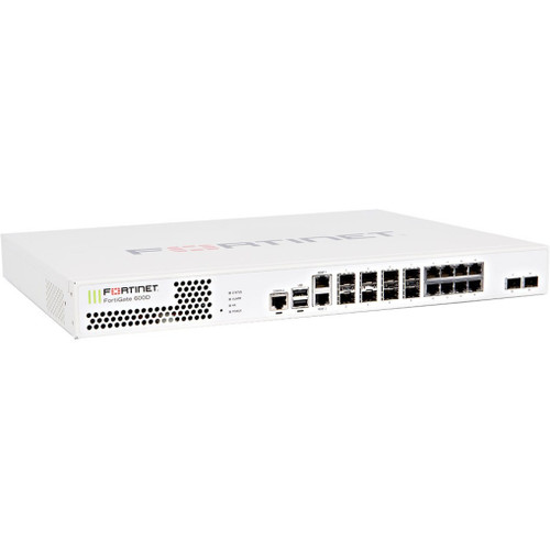 Fortinet FortiGate FG-600D Network Security/Firewall Appliance - 10 Port - 1000Base-T, 10GBase-X, 1000Base-X - 10 Gigabit Ethernet - 4.50 GB/s Firewall Throughput - AES (256-bit), AES (128-bit), SHA-256 - 5000 VPN - 8 x RJ-45 - 10 Total Expansion Slots - 1 Year 8x5 Forticare And FortiGuard UTM Protection - 1U - Rack-mountable