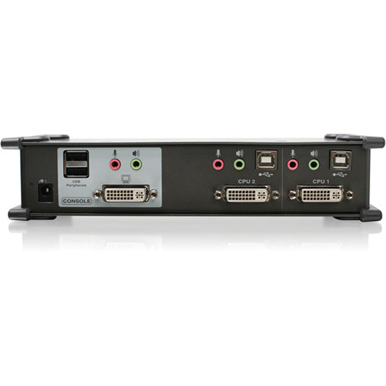 The GCS1104 4-Port USB DVI KVMP Switch with Audio and Cables from Iogear allows a single user to manage 4 separate workstations with one keyboard, mouse, and monitor. Switch between the computers via the switch on the front panel or by hotkey. Asynchronous switching allows you to use peripherals from one computer while the switch targets another one, allowing you to switch without interrupting printing or another peripheral device in use. With support of single-link DVI resolutions up to 1920 x 1200 and full 2.1 stereo audio support, the 4-Port DVI KVMP Switch provides a versatile and convenient way to manage 4 computers from one station.