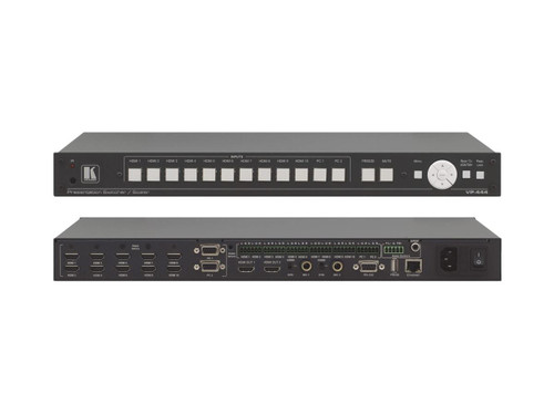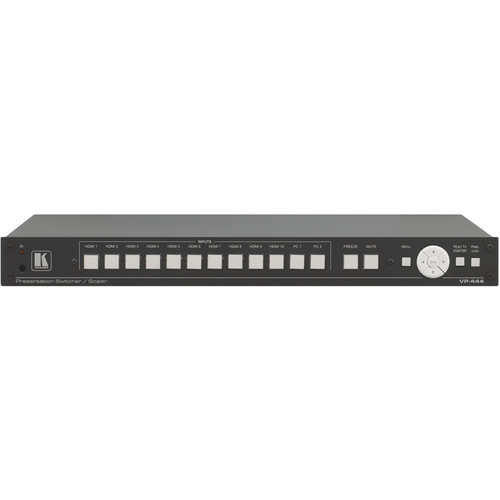 Elevate your presentations to the next level with the Kramer VP-444 12-Input HDMI & Analog ProScale Presentation Digital Scaler/Switcher. This powerful tool provides seamless switching between multiple sources and ensures pristine image quality on any display, making it the ideal solution for conference rooms, lecture halls, and other professional settings.