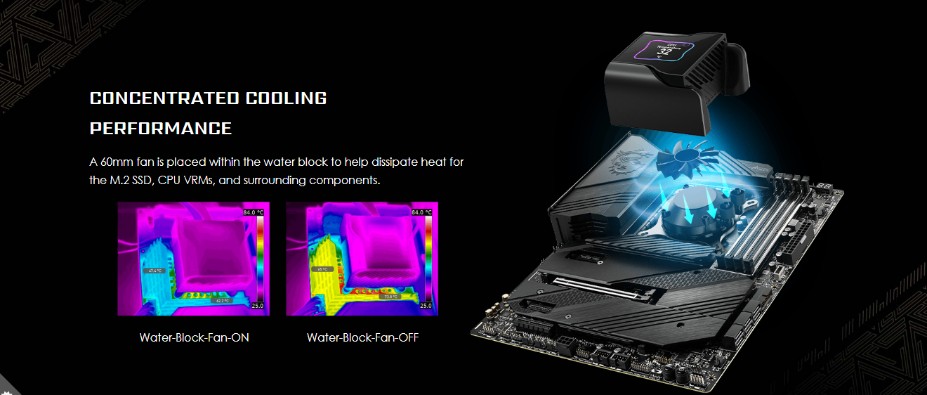 - A 60mm fan is placed within the water block to help dissipate heat for the M.2 SSD, CPU VRMs, and surrounding components.