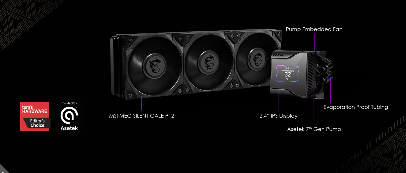 - The MEG SILENT GALE P12 and the water block fan support 0% RPM to ensure zero noise under low temperatures.