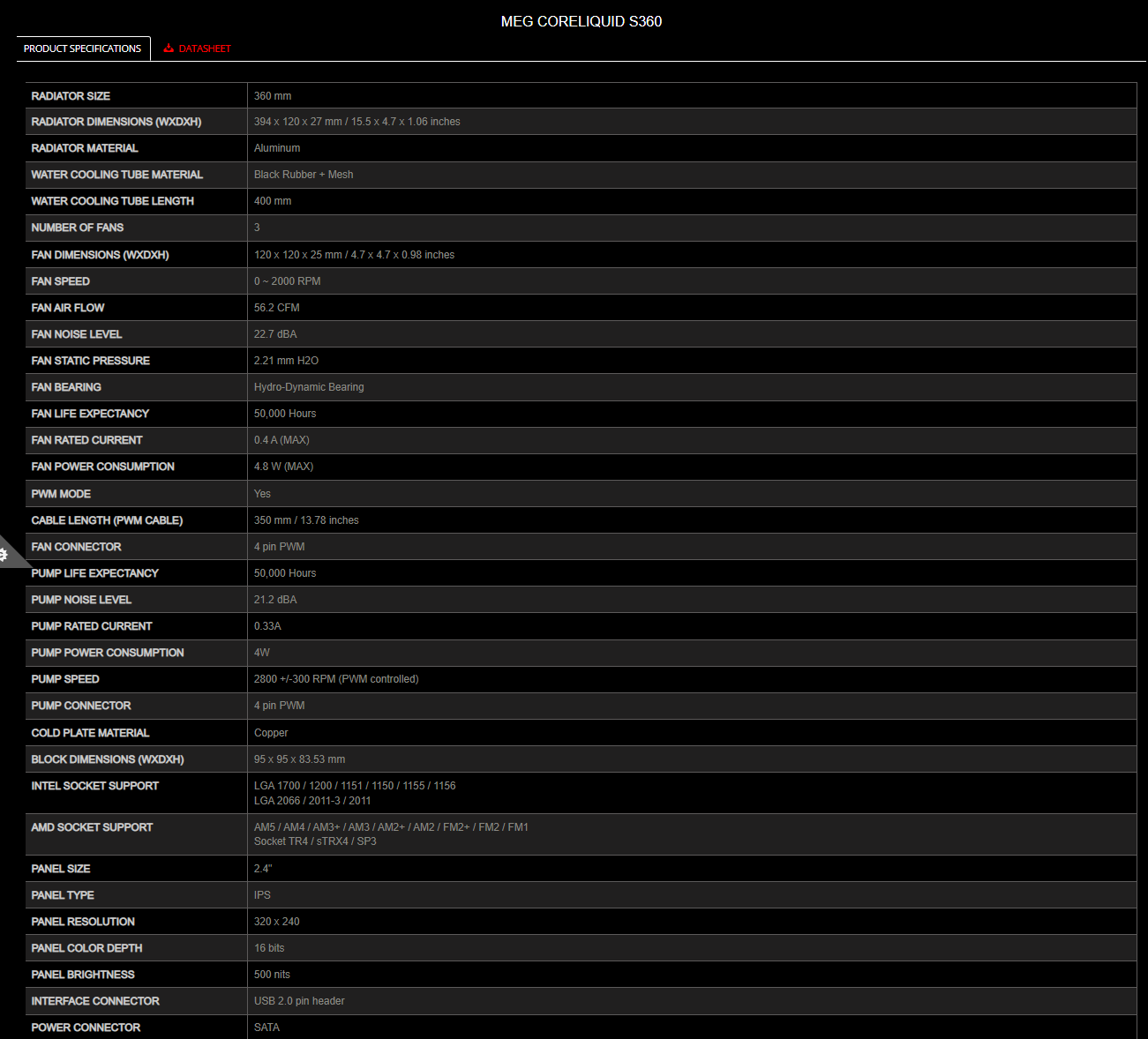 - The MEG CORELIQUID S Series comes with a 2.4” IPS display capable of displaying hardware information, GIF, MP4, photos, texts, and live weather information.