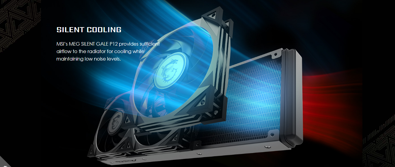 - MSI’S MEG SILENT GALE P12 provides sufficient airflow to the radiator for cooling while maintaining low noise levels.