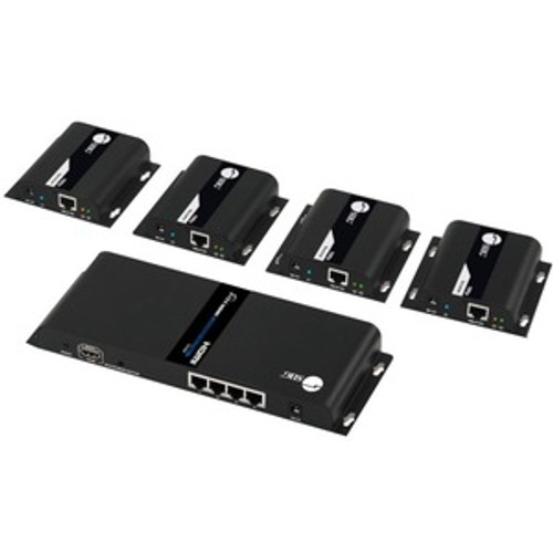 Extends 1080p HDMI signal up to 394ft over Cat6 cable to up to 4 displays, IR control, works with dedicated Gigabit network switches for more displays and extension