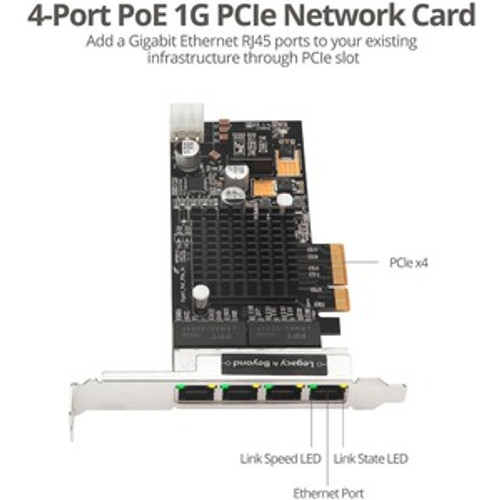 - Adds four independent Gigabit Ethernet ports through an available PCI Express slot to server or desktop systems, with Power over Ethernet capability