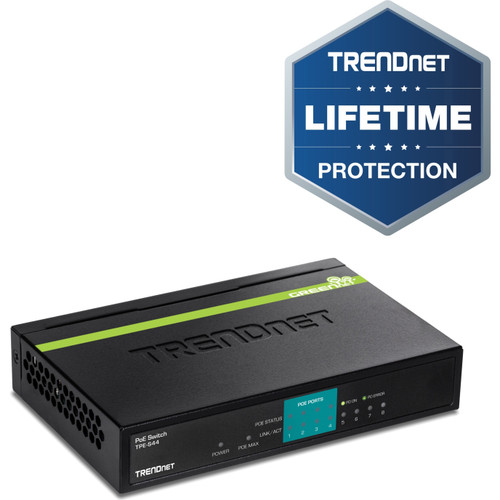 Trendnet 's 8-Port 10/100Mbps PoE Switch, model TPE-S44, offers 4 x 10/100Mbps PoE ports, 4 x 10/100Mbps ports, a 1.6Gbps switching capacity,and a PoE power budget of 30 Watts. Plug and Play this sturdy metal switch for reliable high speed PoE networking. PoE Power A 30W PoE power budget supplies up to four Power over Ethernet devices with PoE power. Fast Ethernet Eight 10/100 Mbps fast ethernet ports produce a 1.6Gbps switching capacity to support edge network installations. Compact Design With a compact and lightweight housing design this switch is well-suited for desktop installations. Its fanless design is perfect for quiet environments that require silent operation. PACKAGE CONTENTS: - TPE-S44 - Quick Installation Guide - Power adapter (48 V DC, 0.8 A)