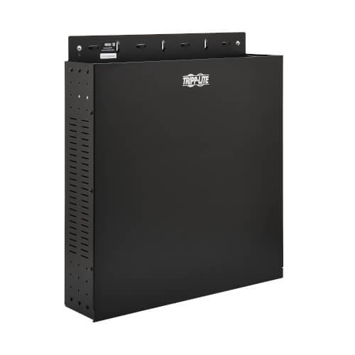 Wall-mount cabinet secures and organizes 2U of rack equipment in confined spaces, such as classrooms and back offices.